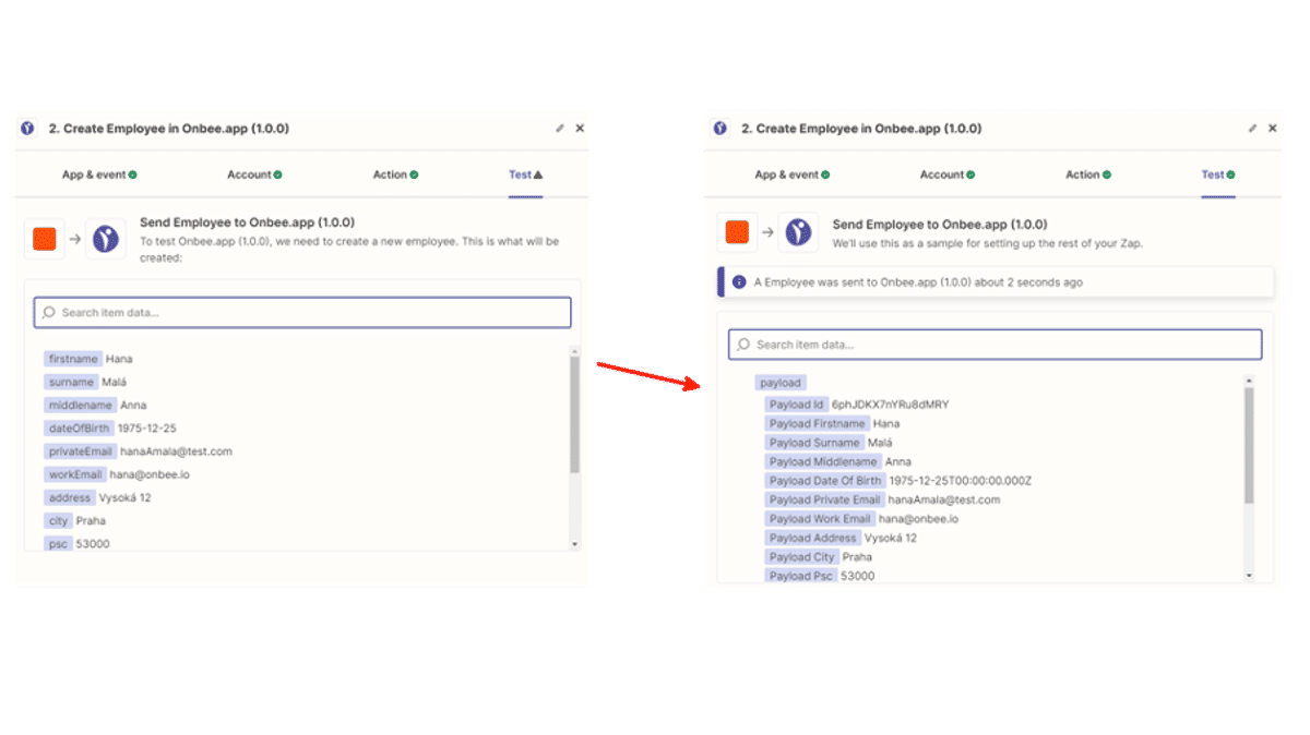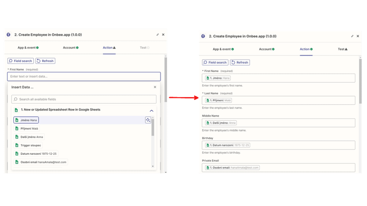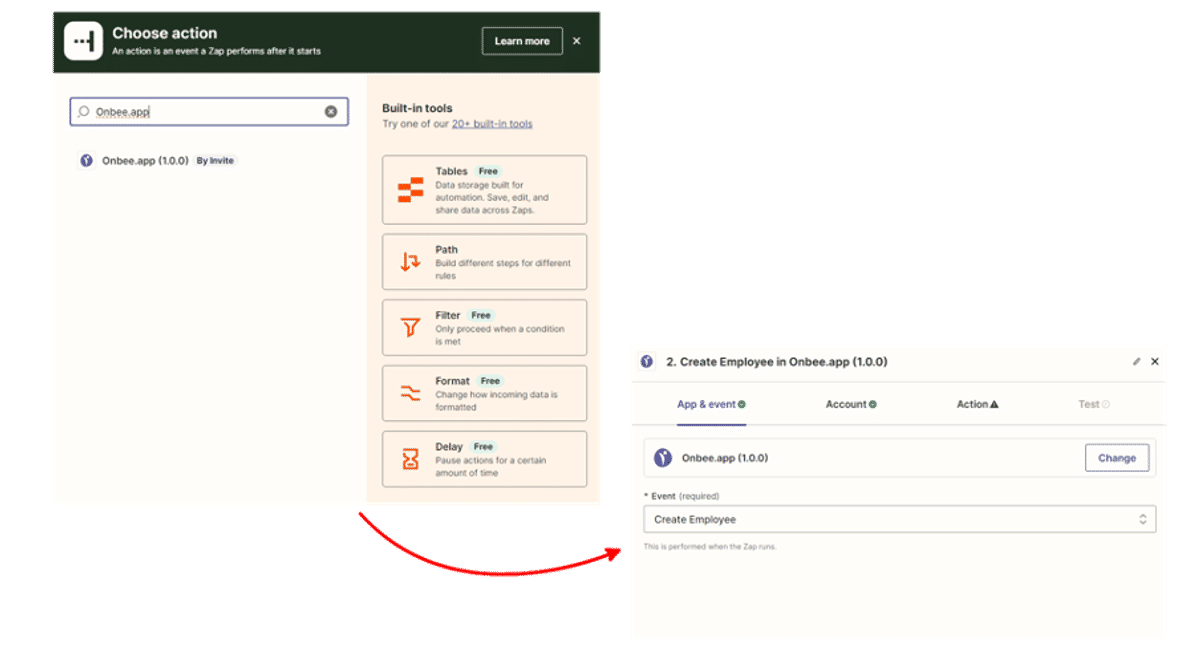 Poté, co jsme si nadefinovali zdroj dat a spouštěč, nastavíme si, co s těmito daty dělat. V našem případě vybereme Onbee.app a akci "Create Employee in Onbee.app".