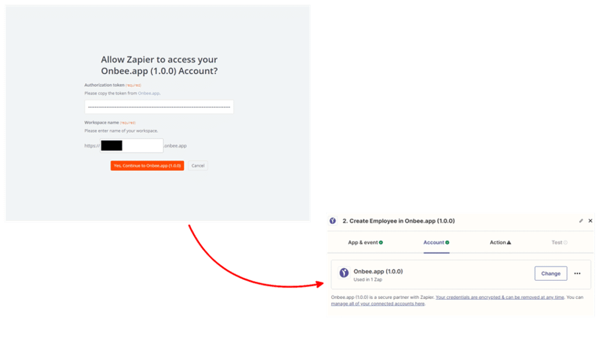 Zapier funguje na principu, kterému říkají "Zap", což je automatizovaný postup, který spustí určitou akci (“action”) - např. založí zaměstnance v Onbee.app, pokud nastane specifická událost (“trigger”) - např. pokud přibude nový řádek v Excelu s informacemi o zaměstnanci.