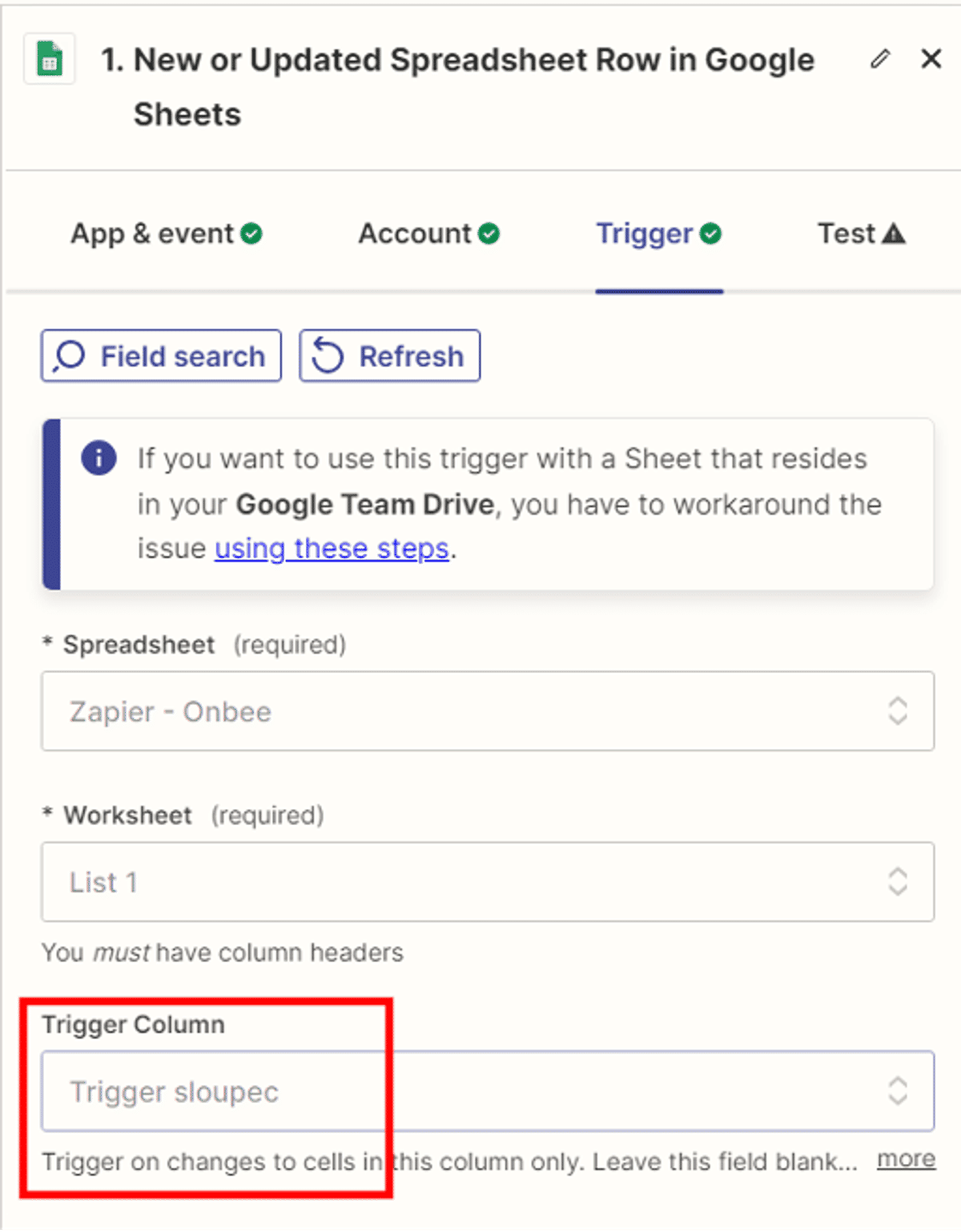 💡 V této části také definujeme, který konkrétní sloupec bude použit pro spuštění události. To je důležité především pro situace, kdybychom do tabulky chtěli zapisovat ručně, případně chtěli ručně vybírat, které řádky chceme přenést – poté, co se objeví hodnota ve spouštěcím sloupci, Zap se pokusí přenést údaje a mohlo by se tedy stát, že pokud spouštěcí sloupec vyplním první, dojde k chybě a Zap se pokusí přenést prázdný řádek pouze s touto hodnotou.