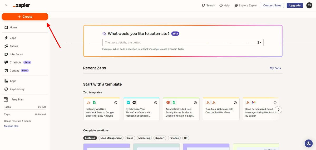 Zap můžete vytvořit buď kliknutím na tlačítko "Create" v levém horním rohu nebo na hlavní stránce vyplněním čtyř políček pro vytvoření Zap.